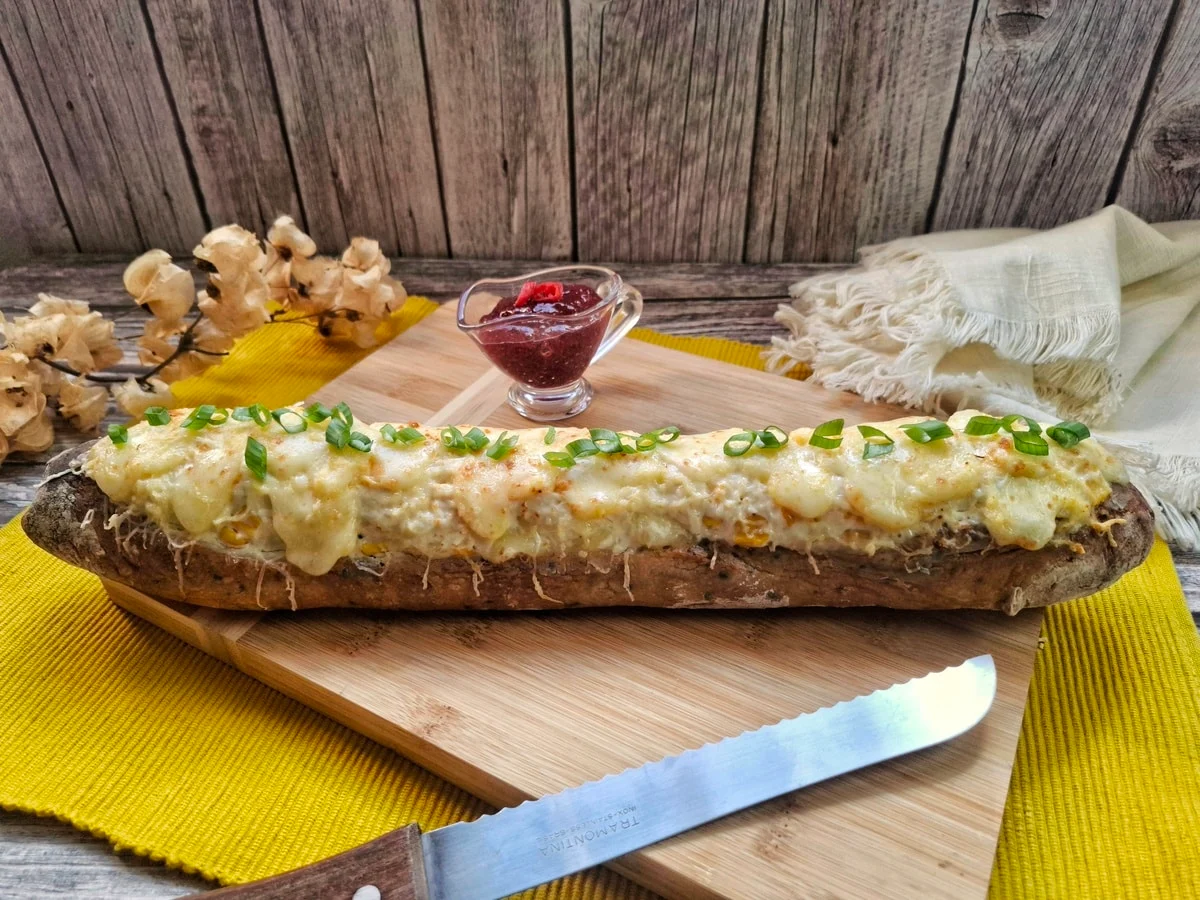 A cobertura leva 100 g de mussarela ralada, responsável pelo dourado irresistível. Completa a lista um pão baguete de 40 cm, que vira uma “canoa” perfeita para acomodar o recheio.