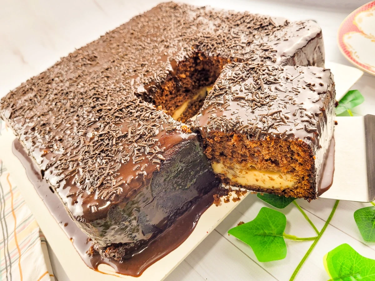 Receita de bolo de chocolate cuja massa é assada junto com o creme, evitando a etapa de corte e recheio após o forno. A preparação inclui cobertura simples para finalizar.