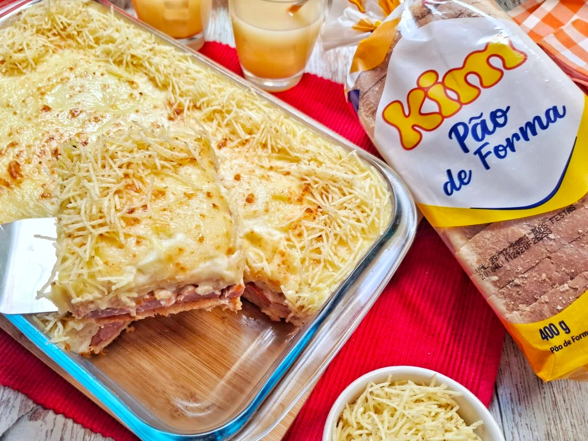 A base leva 6 salsichas cozidas por 2 minutos em água fervente e cortadas ao meio. Na sequência, entram 8 a 10 fatias de pão de forma sem casca, previamente achatadas com rolo para ficarem compactas.