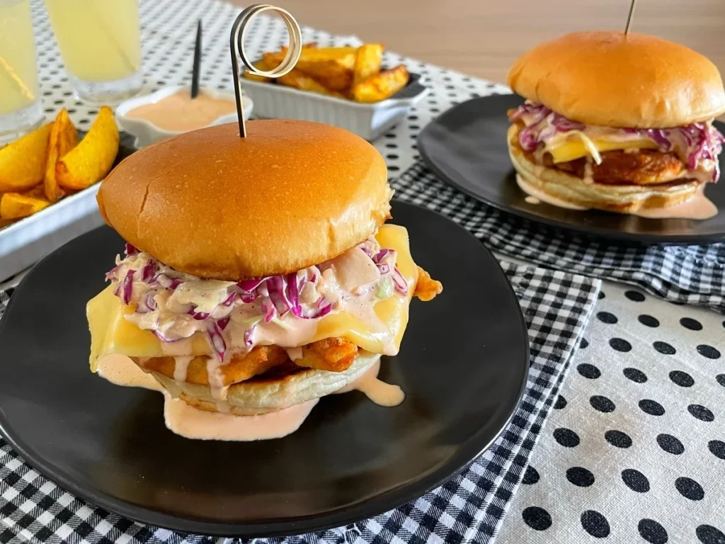 Para montar, doure levemente dois pães de hambúrguer na frigideira, acomode o frango frito, adicione uma fatia de queijo prato e finalize com a salada de repolho envolvida na maionese. Sirva imediatamente.