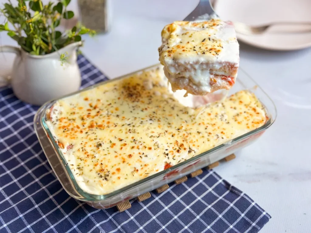 3. Salpique mussarela ralada, repita as camadas de pão, molho de tomate e presunto, finalize com o restante do creme e mais queijo por cima. Polvilhe orégano para garantir aquele perfume irresistível.