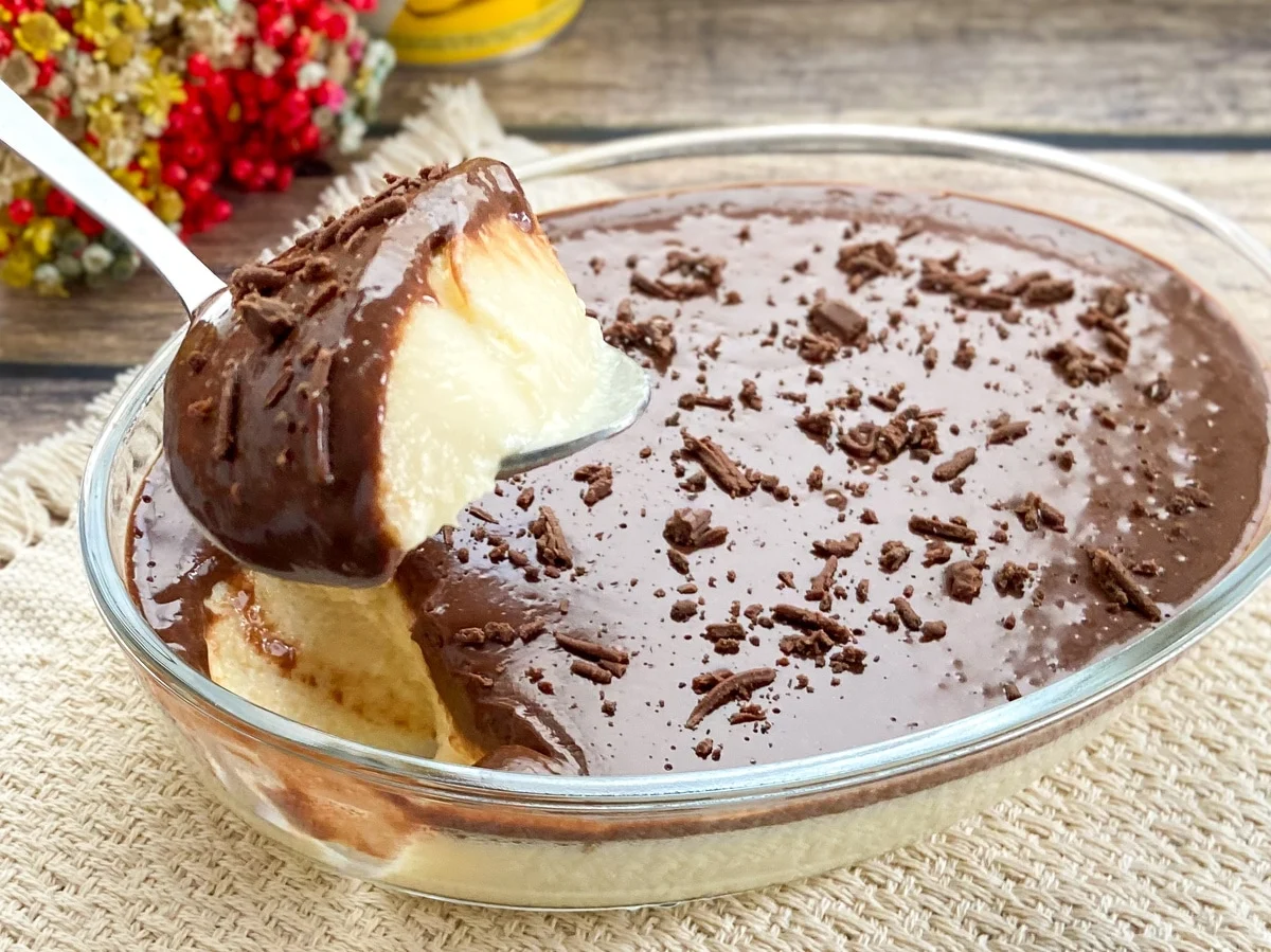 Esta sobremesa une o creme de leite em pó com cobertura de chocolate, formando uma mousse firme e coberta por ganache.