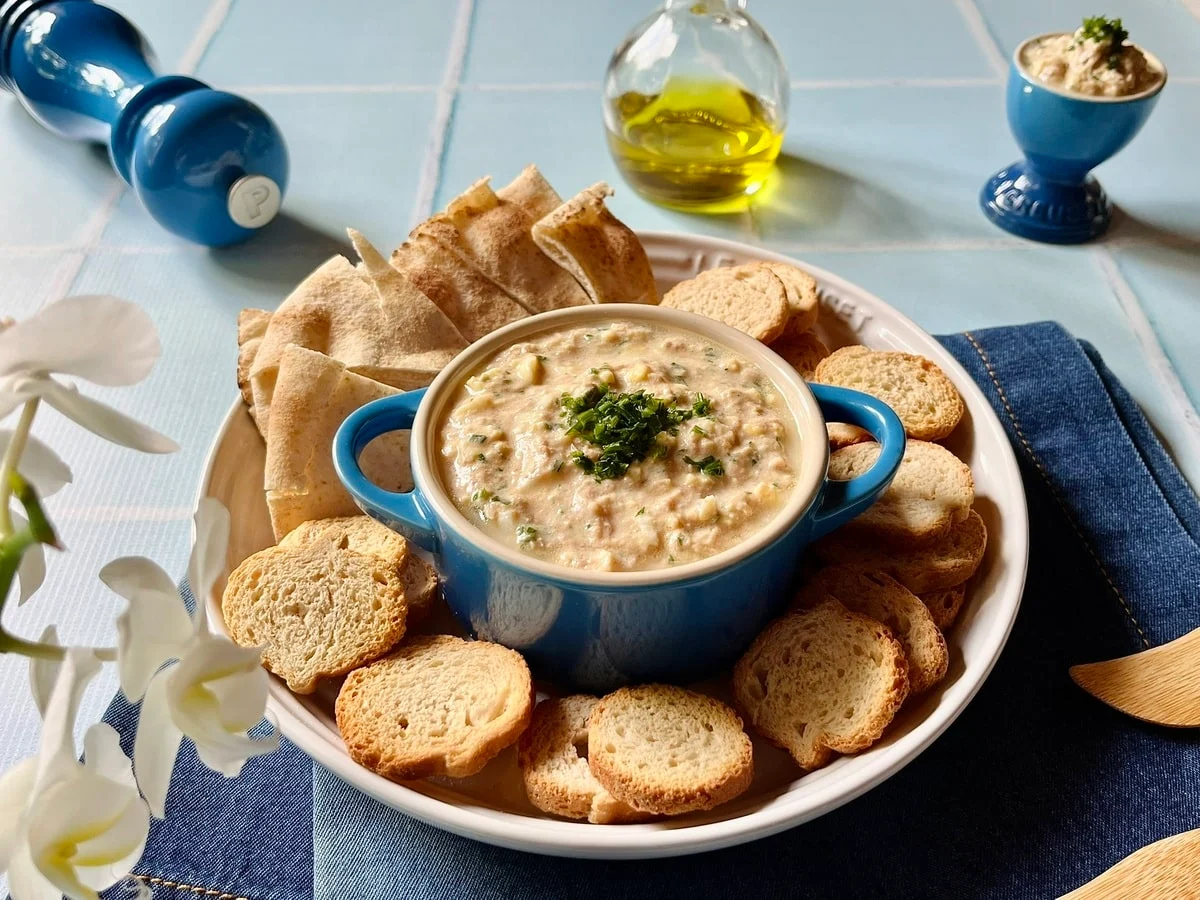Esta receita apresenta um patê de atum preparado com ovos cozidos e iogurte natural, resultando em uma opção leve para acompanhar pães, torradas ou barquetes.