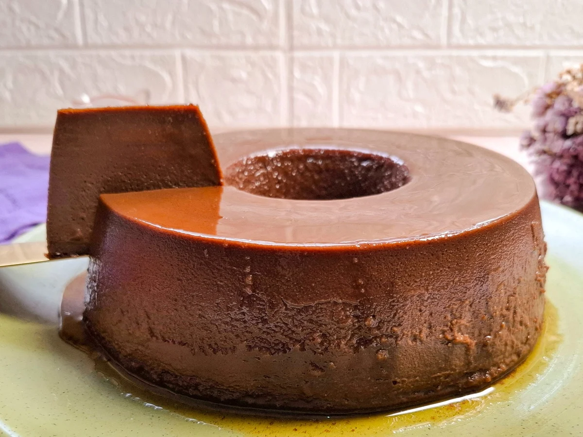 Sobremesa assada em banho-maria que combina chocolate em pó 50% cacau com leite condensado, resultando em pudim de textura cremosa e calda de caramelo.