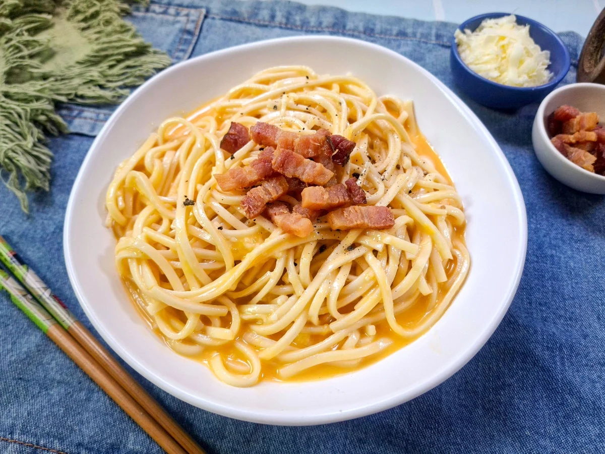 Que tal dar um descanso ao espaguete e levar um toque oriental para a cozinha? O chef autodidata Carlos Lopes criou um udon carbonara que mistura a cremosidade clássica do prato italiano com a textura elástica do macarrão japonês.